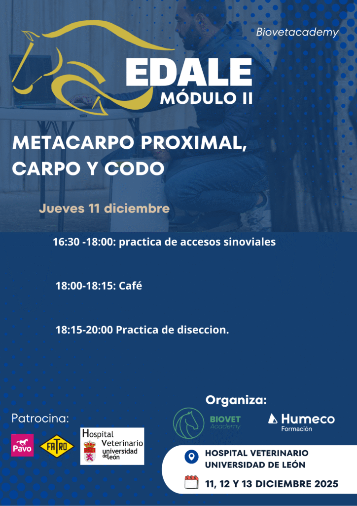 El Módulo II del Programa EDALE se centra en las regiones anatómicas clave del miembro anterior del caballo: metacarpo proximal, carpo y codo. Una formación esencial para veterinarios que buscan dominar el diagnóstico y manejo de cojeras en estas zonas críticas.
